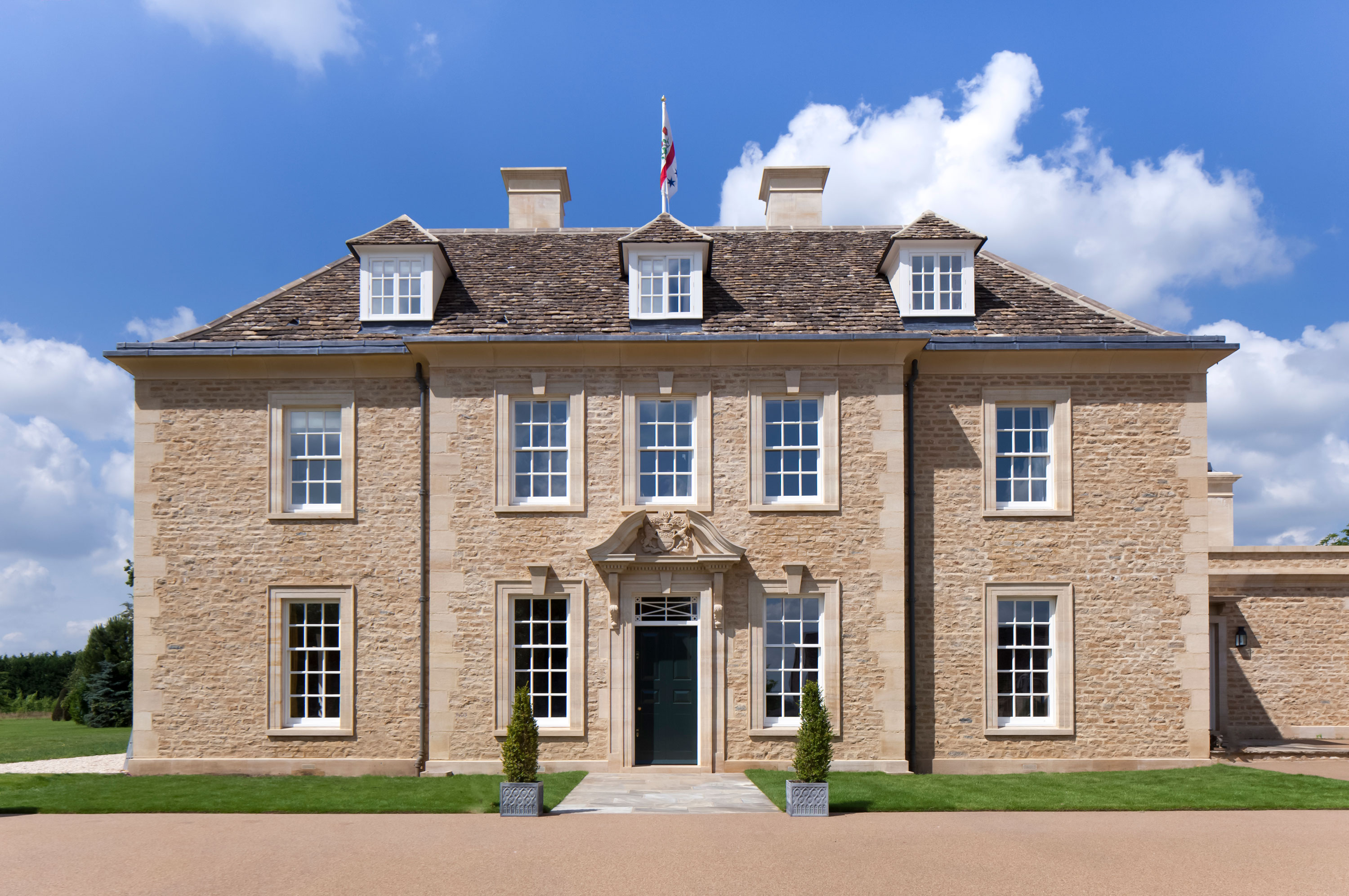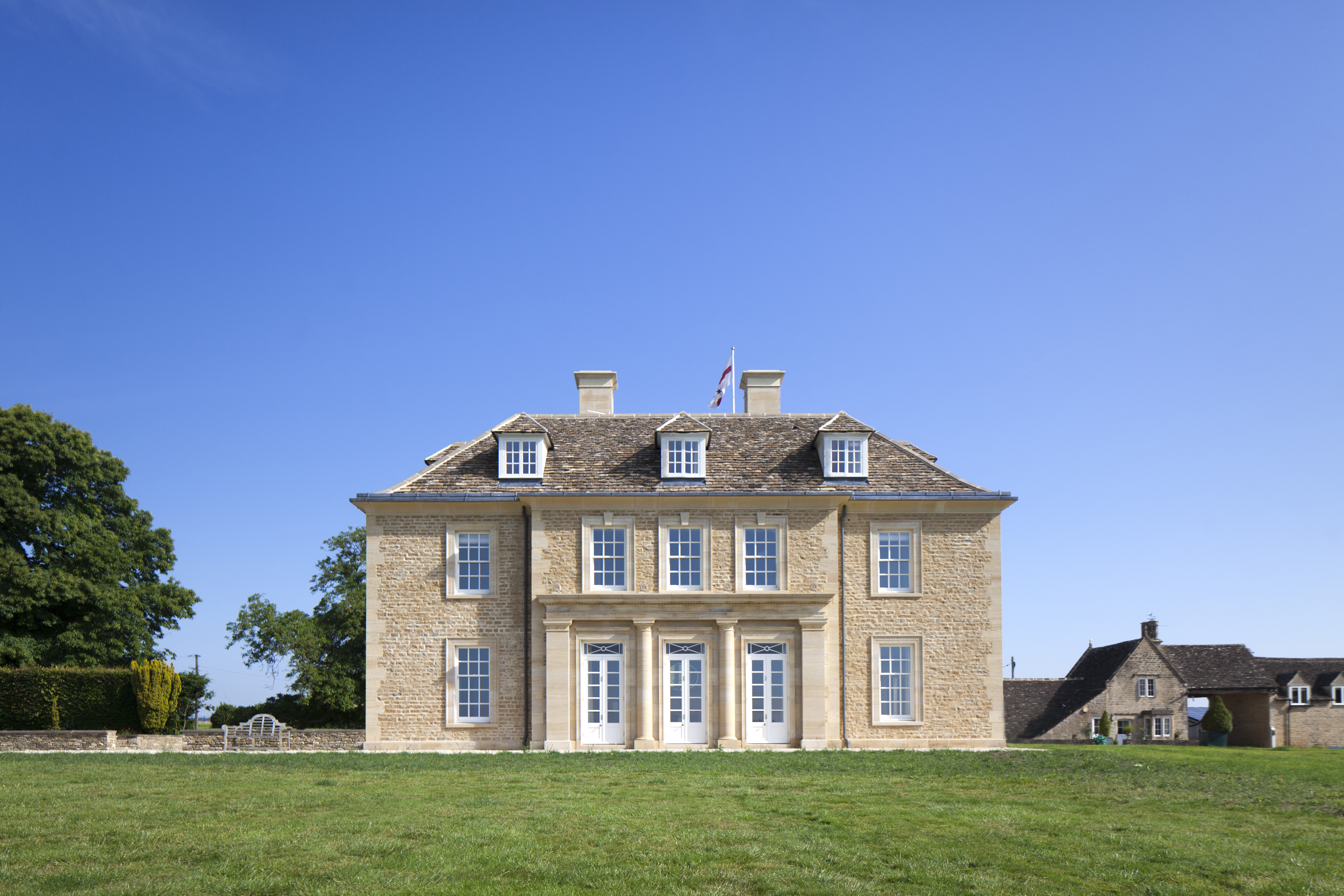The house has a square plan to the main block with an elegant suite of reception rooms located around the core of a gracious, top lit central hall. The house is very much in the Cotswold William and Mary and Queen Anne idiom. It has a tall sprocketed roof with walls of both locally quarried stone to the walls, and finely mounted ashlar work to the window surrounds and door openings. The serenity of the composition is very much the result of much attention to proportion and our understanding of perfect window to wall proportions.