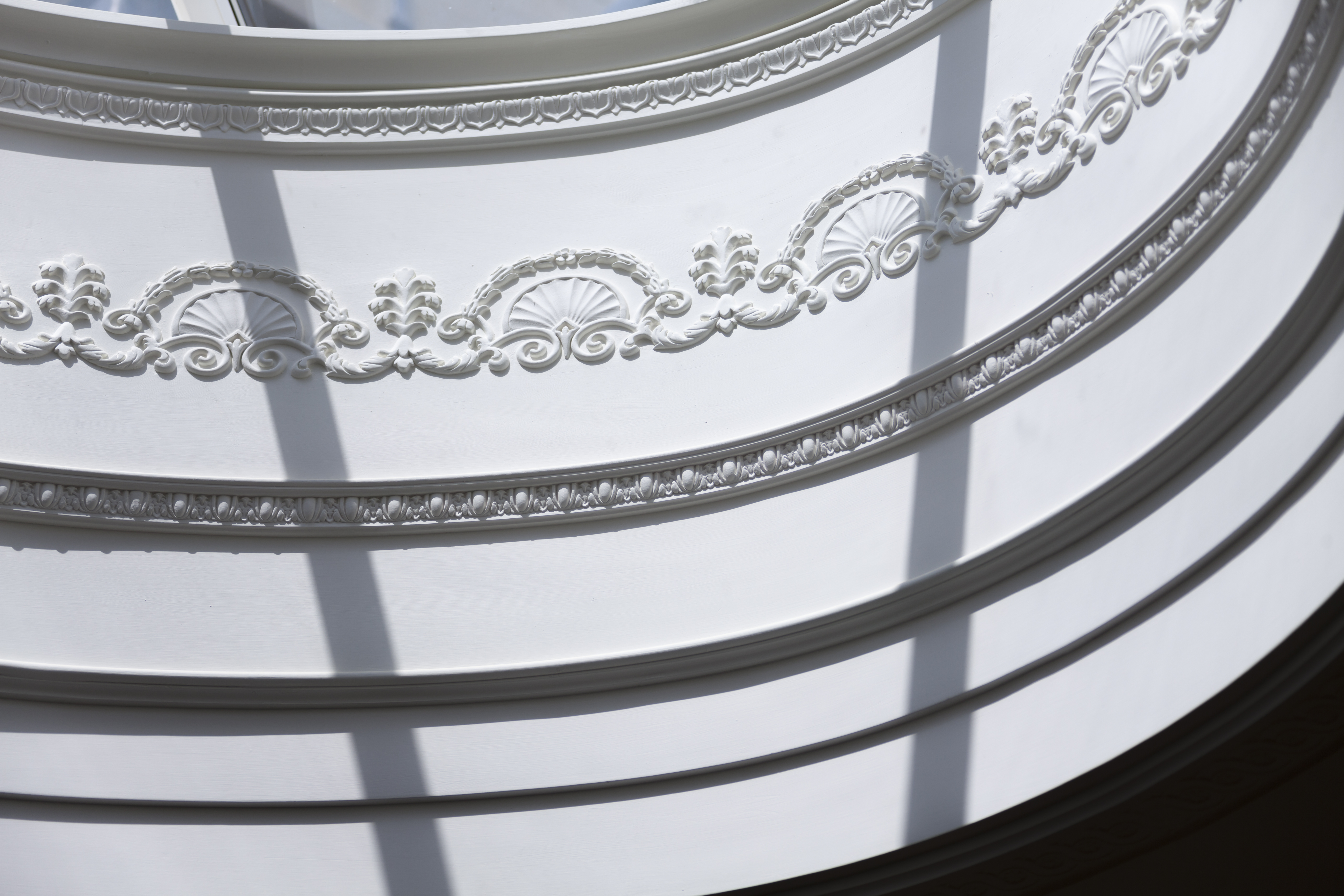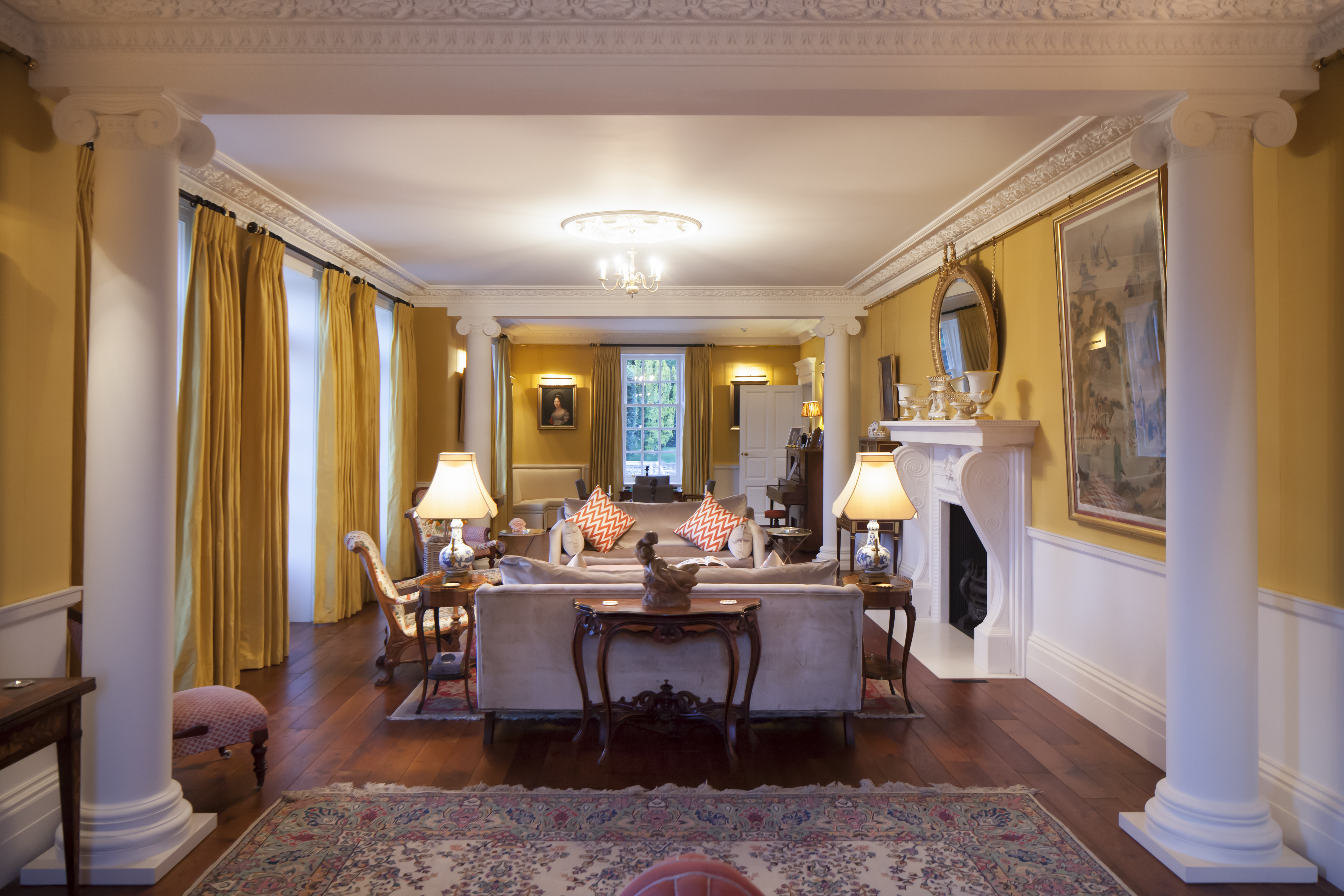 Inside, the house is richly detailed. The main fireplaces were designed uniquely by us for the house and complimented by the ornate plasterwork, including very special columns and capitals to the drawing room, which also contains a magnificent statuary marble fireplace. The staircase has finely turned balusters, Corinthian newel posts and ornately carved ends, as well as a grand roof lantern. All the bedrooms on the upper floors have beautiful views over the parkland and beyond.