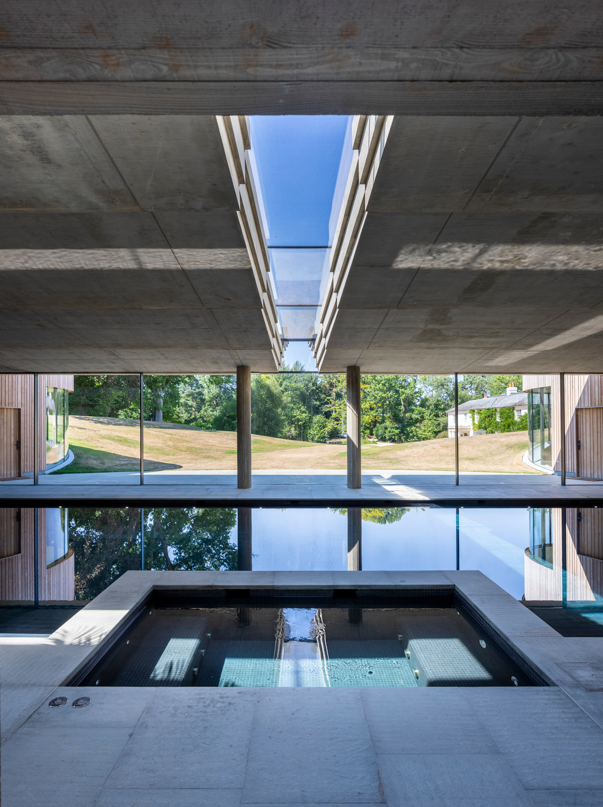 Being created under the walled garden gives the leisure building a visual connection to the main house and provides views across to the lake and woods, whilst maintaining the walled garden as an important feature in its own right. The walled garden is a closed-off, inward-looking space providing strength and security for the pool building to back onto, enabling it to then open itself up to the lake opposite. With the building set in the ground, the walled garden remains a strong and visible feature on the site. The ground still slopes down and away from the walled garden to the lake, with just the timber-clad gym and hammam ‘pods’ protruding.