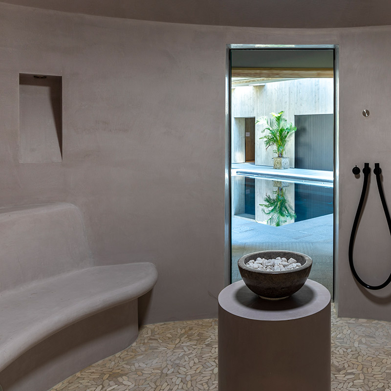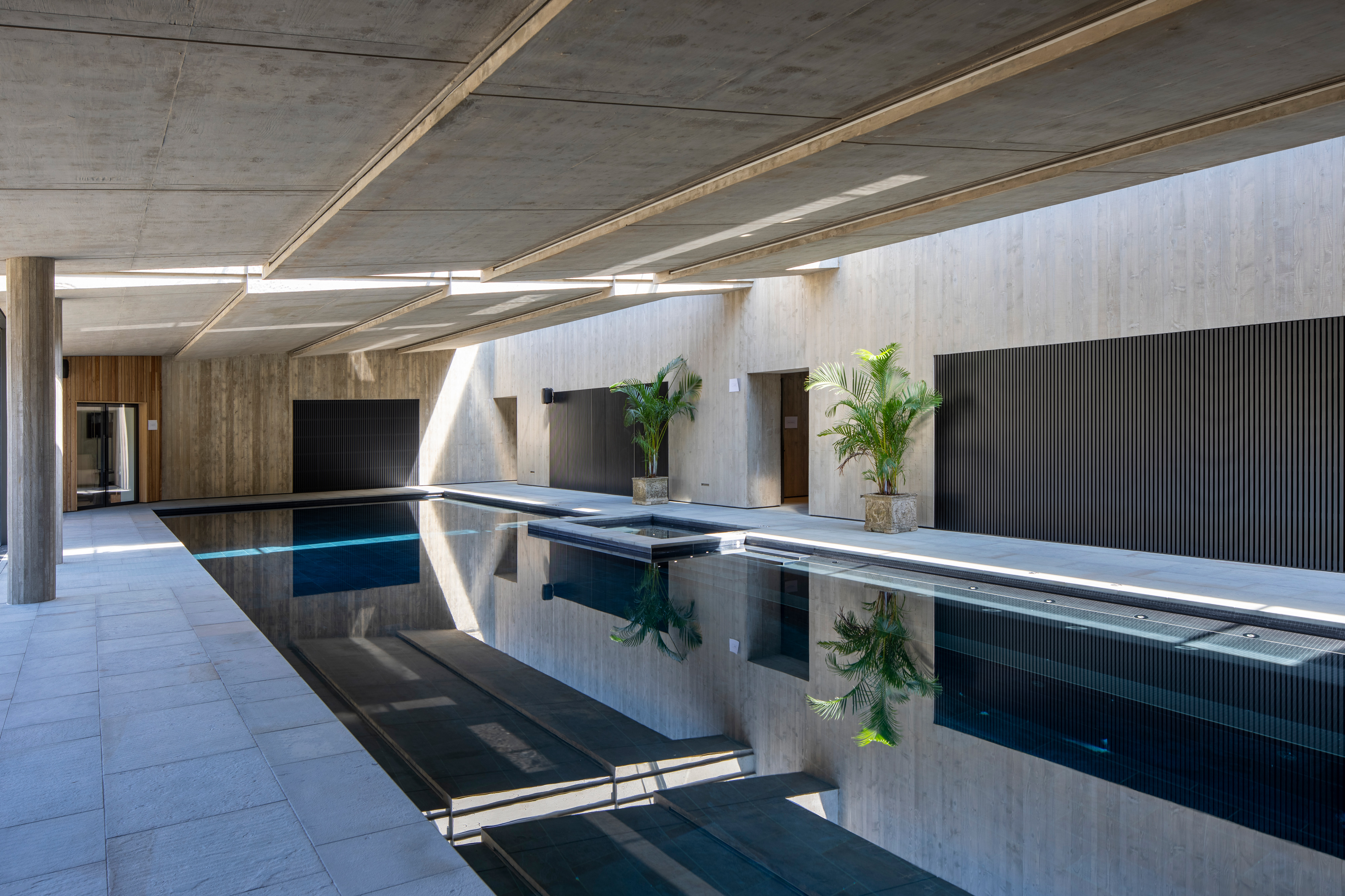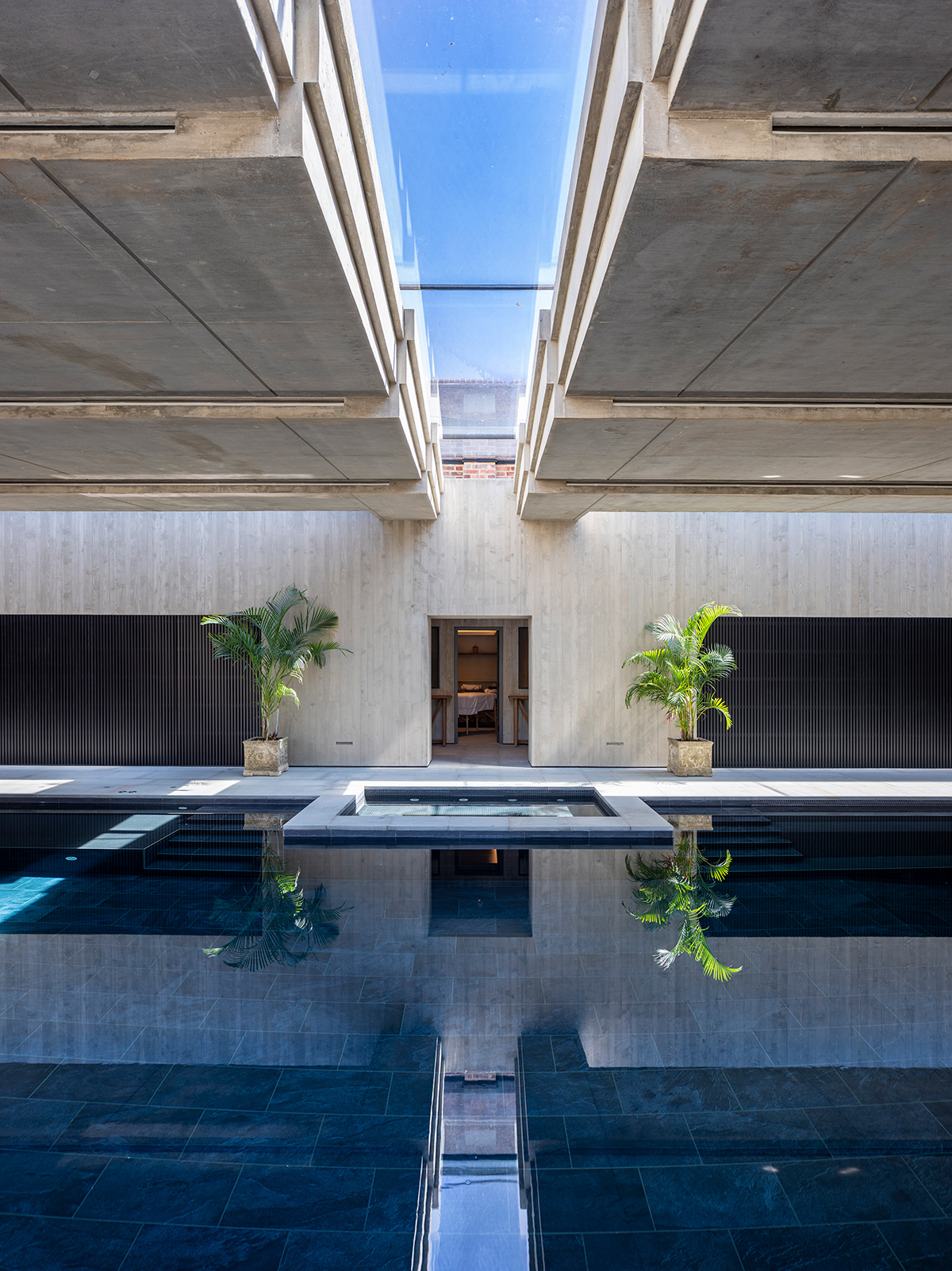 The contradiction of the structure is followed through in the material choice. The solidity and man-made characteristics of concrete countered with the texture and appearance of natural timber imprinted in its surface. What looks like silvered timber boards from a distance is actually hard, solid and man-made when you get up close. This is played with further as the gym and hammam pods are actually clad in silvered timber boards with the two material choices running past each other at the entrance to the Onsen bath.