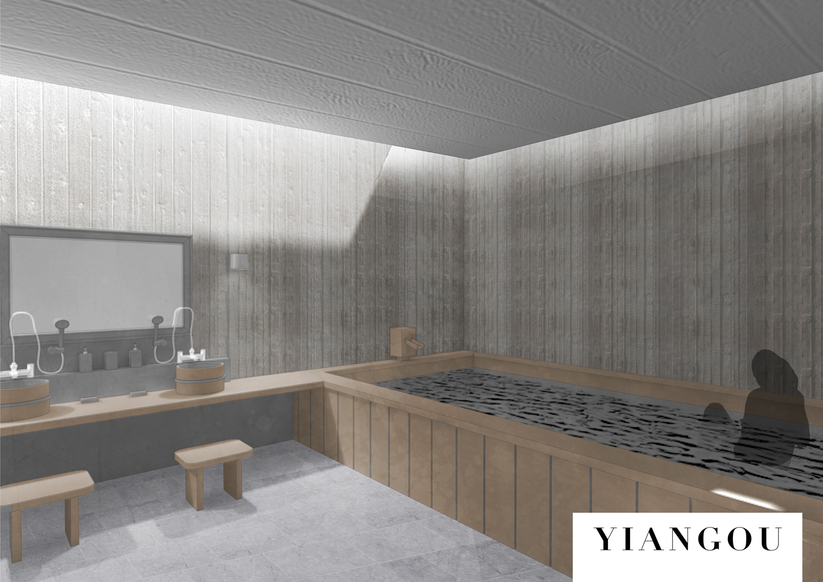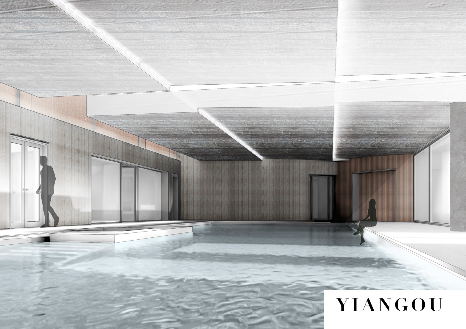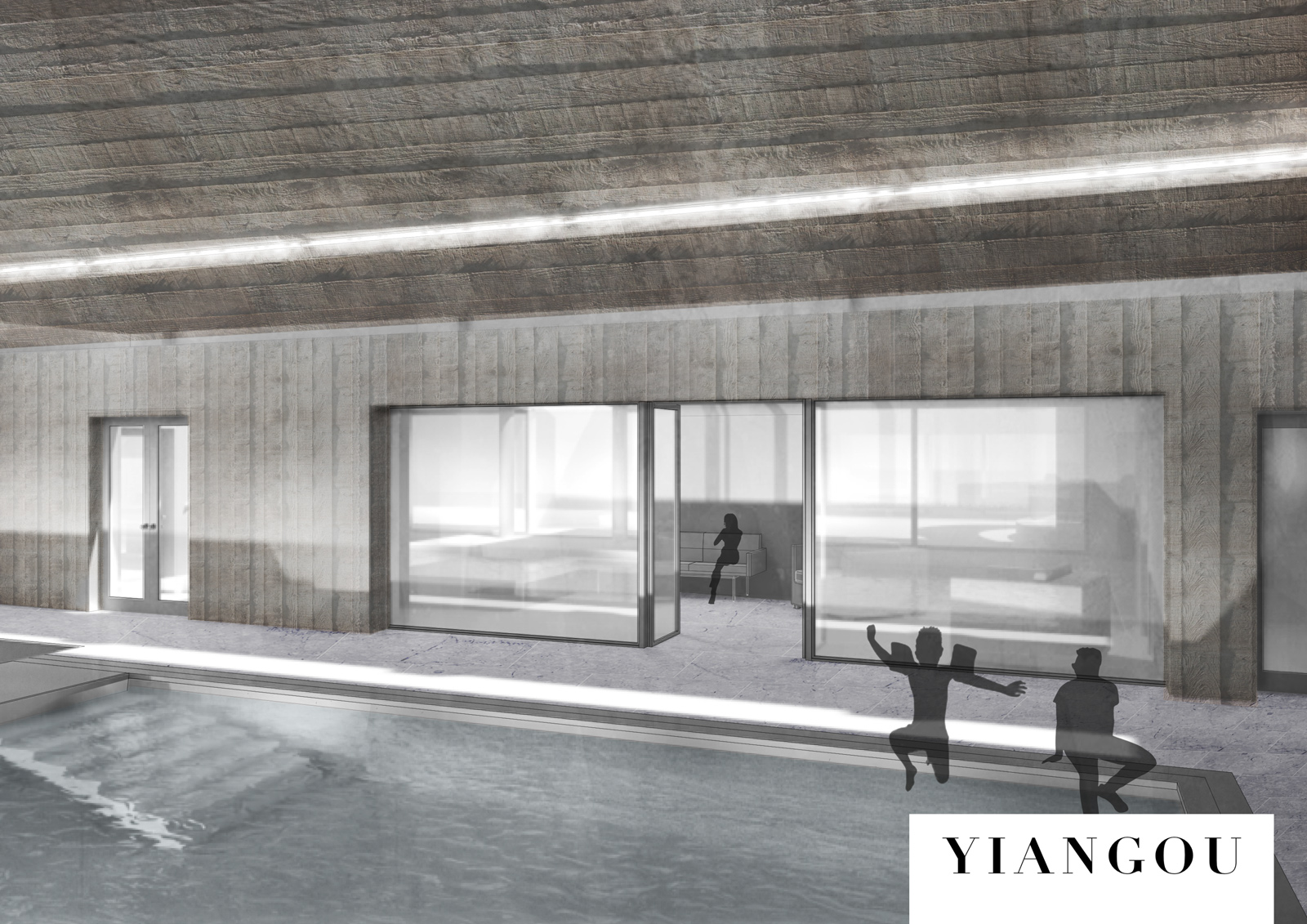 The contradiction of the structure is followed through in the material choice. The solidity and man-made characteristics of concrete countered with the texture and appearance of natural timber imprinted in its surface. What looks like silvered timber boards from a distance is actually hard, solid and man-made when you get up close. This is played with further as the gym and hammam pods are actually clad in silvered timber boards with the two material choices running past each other at the entrance to the Onsen bath.
