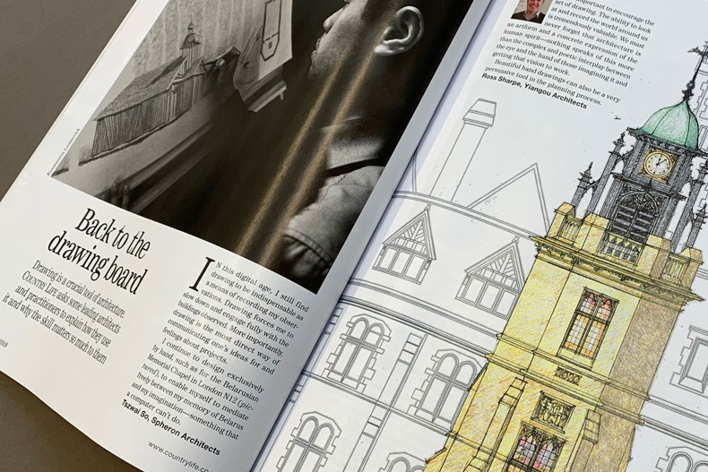 Hand-drawing is woven into the way that many of our Architects work, and we were very pleased to be invited to contribute to this fascinating article in Country Life. This illustration is of the new Clock Tower that Ross Sharpe designed for Harris Manchester College in Oxford.